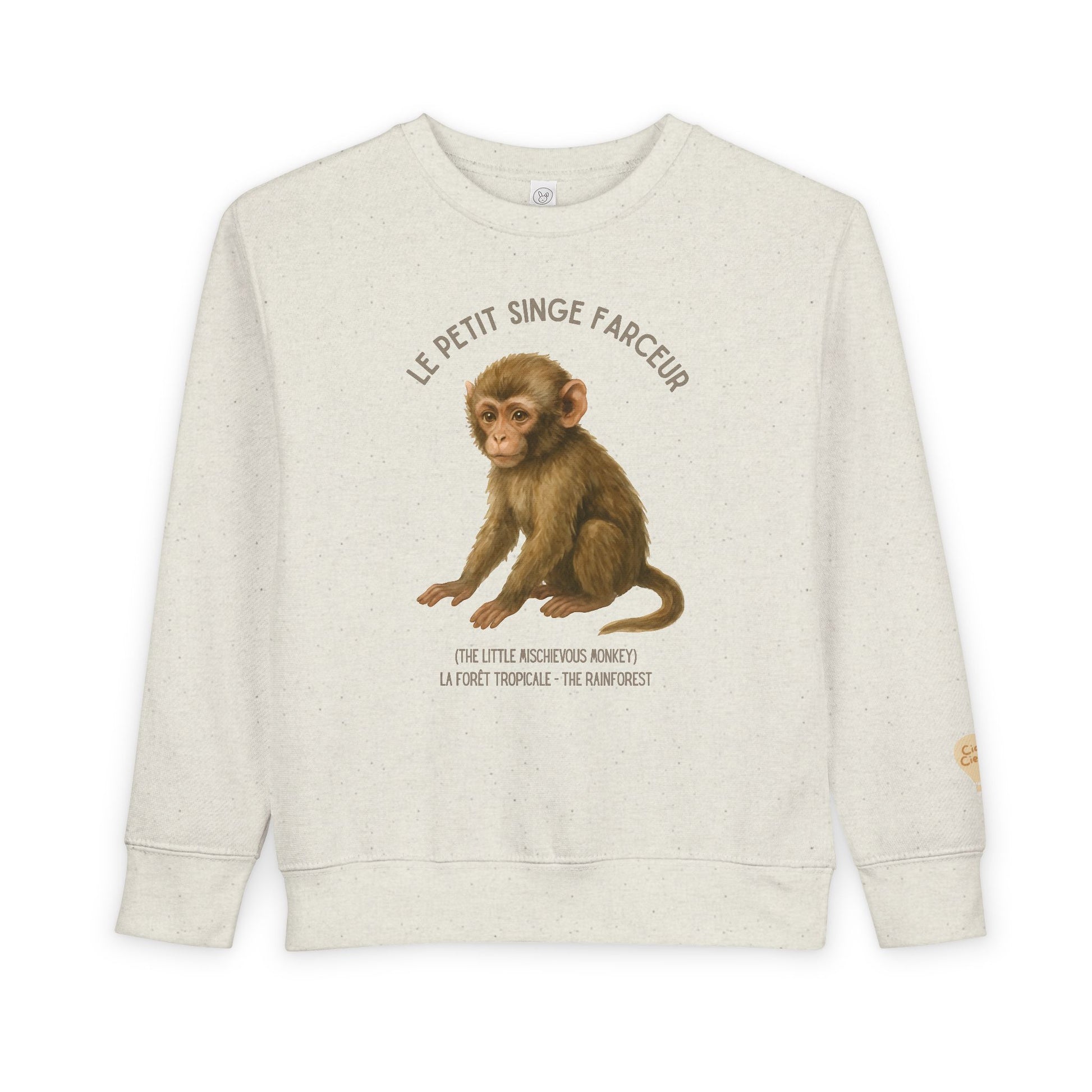 A soft, gently speckled toddler sweatshirt that feels like a cozy storybook hug. The vintage-style baby monkey print and warm neutral tone create a calm, whimsical look that settles easily into everyday play and quiet moments alike. Lightweight but substantial, the midweight fabric and ribbed cuffs hold their shape through tumbles and washes. Thoughtful details — like the tear-away label and comfortable collar — keep little ones content while parents appreciate a simple, durable piece that layers well during cool mornings or sleepy afternoons at home.