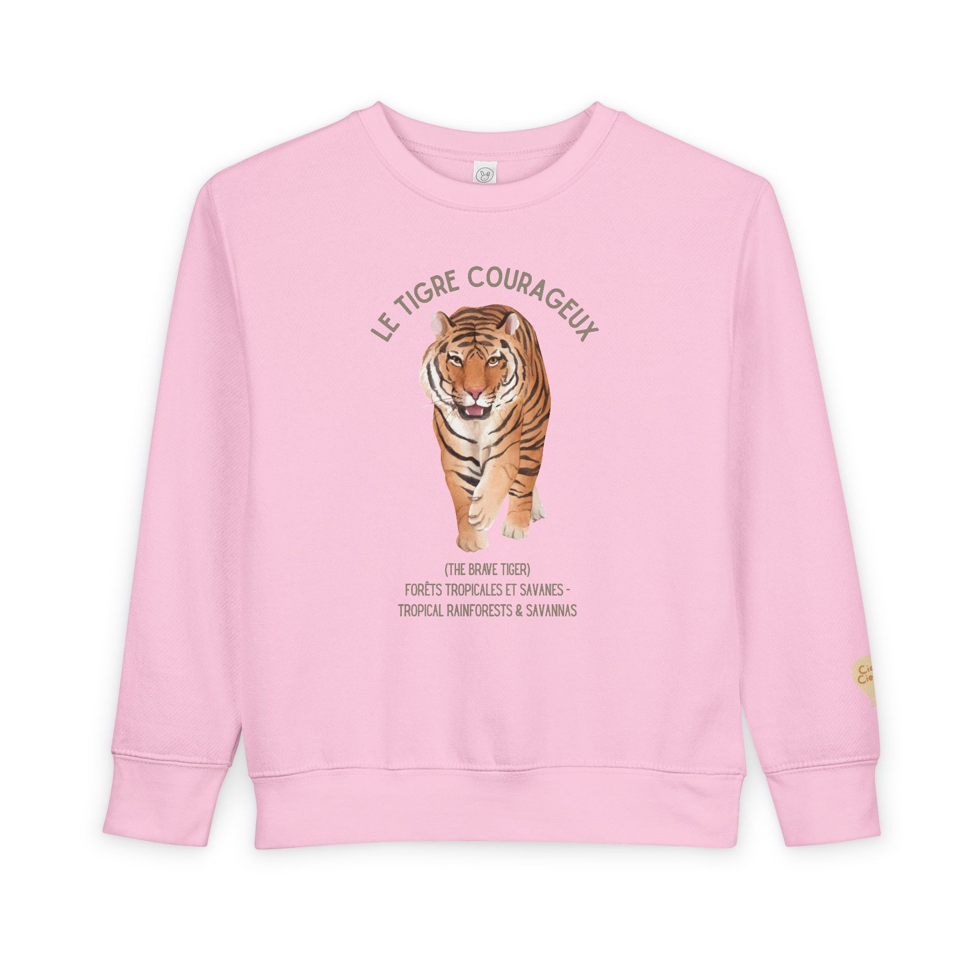 Soft, slightly slouchy sweatshirt for little ones who love bold animals and quiet adventures. A hand-drawn tiger prowls across the chest in warm, vintage tones, with subtle text in French that hints at bravery and distant jungles. The fabric has a gentle, lived-in feel — not too heavy, not too thin — so it layers easily over shirts or stands alone on cool mornings. Sleeve ribbing and a boxed hem keep the silhouette tidy while the tear-away label prevents irritation, letting kids move and explore without fuss. It reads like a small story: a cozy moment at home, a backyard expedition, or a school day where confidence shows up in the details.